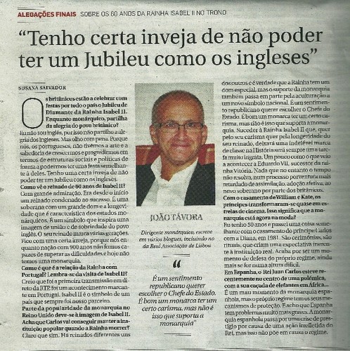 Eu não sou inglês, por isso não partilho a alegria dos ingleses. Mas olho com pena Porque nós, os portugueses, não tivemos a arte e a sabedoria de crescermos e progredirmos em termos de estruturas sociais e políticas de forma a podermos ter uma festa semelhante a deles. Tenho uma certa inveja de não poder ter um Jubileu como os ingleses.
